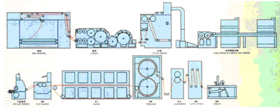 The combined frame is consist of Machines of opening and blending, material supplying, carding, net spreading, open-end netting, dipping, drying, ironing, fabric storing, calendaring and fabric rolling.